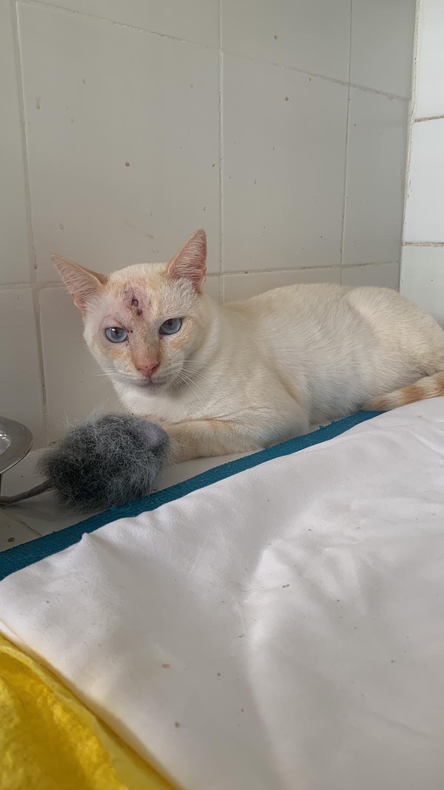 Azul wurde 2024 mit seinen Geschwistern in einer Katzenkolonie in Tarifa geboren. Nachdem er von älteren Katzen mehrfach attackiert wurde, suchte er sich eine neue Futterstelle. Ende Juni tauchte er dort verletzt auf: geschwollene Stirn, geschlossene Augen und blutige Wunden an Pfote und Auge. Beim Tierarzt wurde ein mit Blut und Eiter gefülltes Ödem festgestellt, das von einem Biss stammte. Eine Drainage und viel Pflege im Tierheim retteten ihm das Leben. Vor kurzem musste noch ein Knochensplitter entfernt werden.